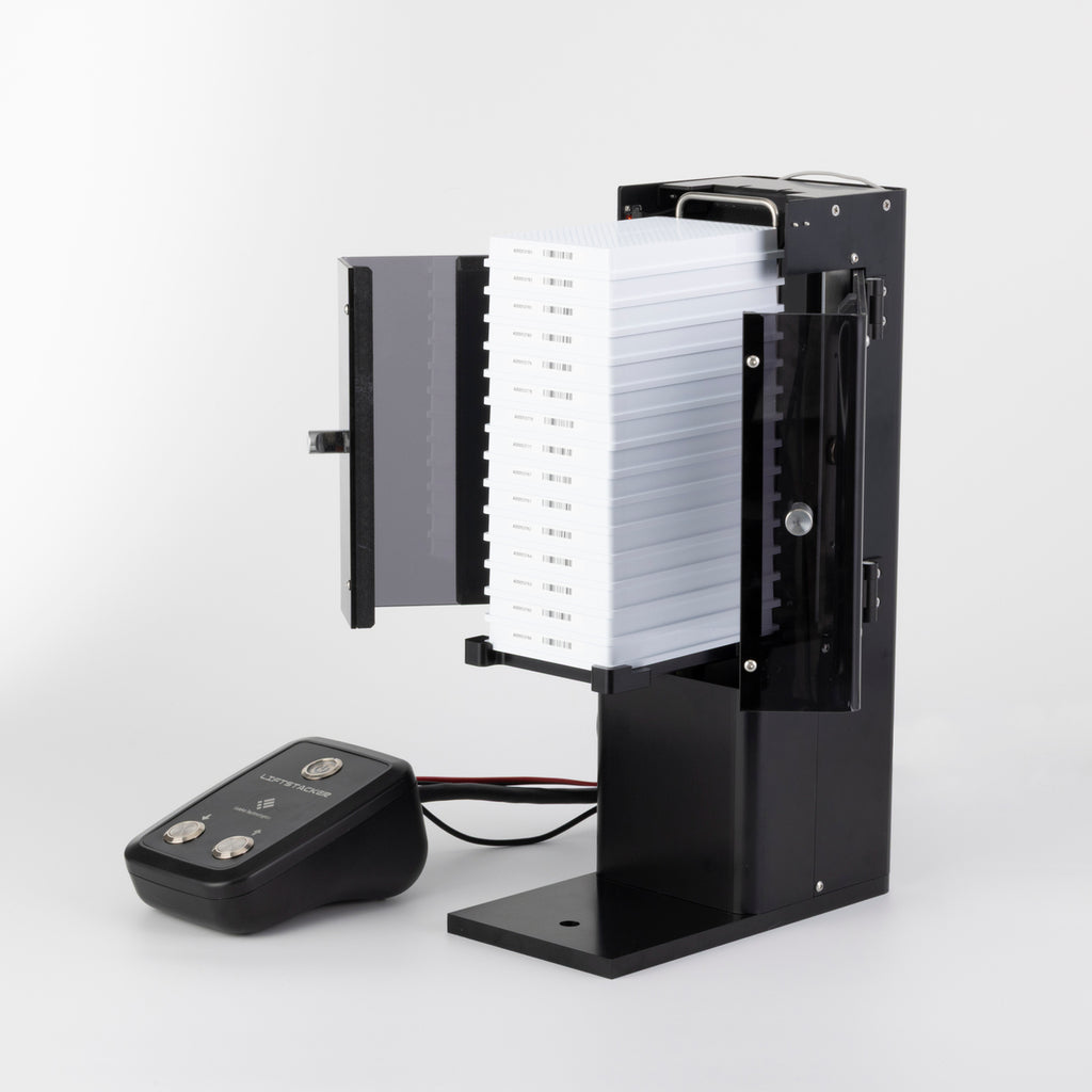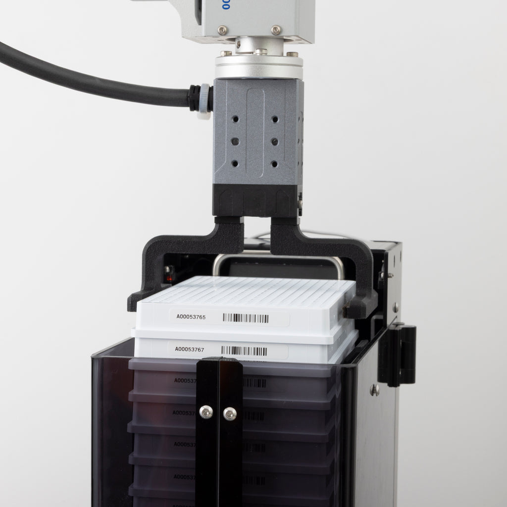 LiftStackerはラボ自動化のためのプレート供給を行う小型装置です。マイクロプレートより一回り大きい程度のフットプリントで、積み重ねたプレートを搬送ロボットに一番上から順次供給できます。完全独立稼働となっており、面倒な通信制御をする必要はありません。