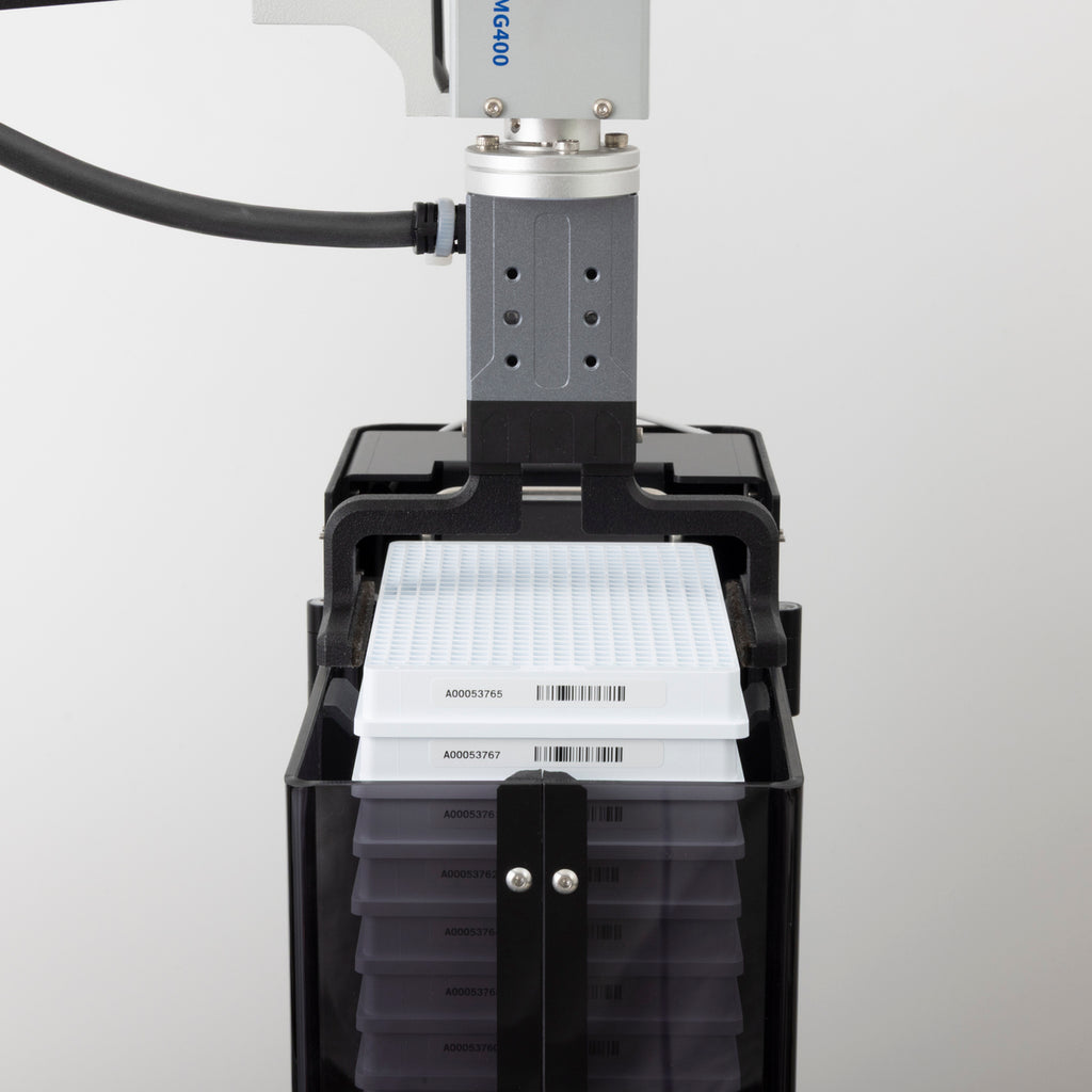 - 最大15枚のマイクロプレートを積み重ねでき、高さの異なるプレートを混在利用することも可能です(積載できる枚数はご使用のプレート高さに依存します)。